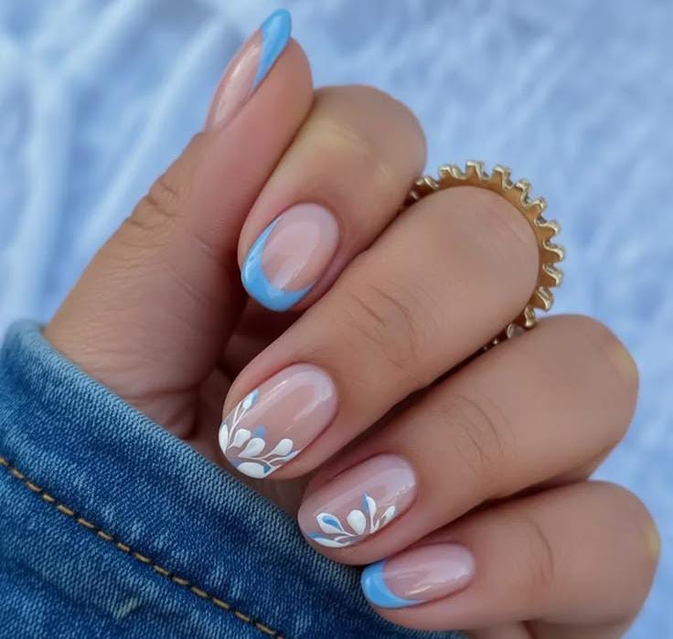 A soft nude base is paired with fresh sky-blue French tips for a clean and modern spring look. Small white leafy floral accents add a delicate minimal and airy April vibe.