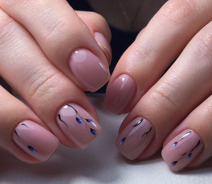 Soft nude nails feature delicate black branch lines with tiny blue buds for a subtle floral design. The look is minimal, clean, and perfect for a gentle April spring aesthetic. 🌿