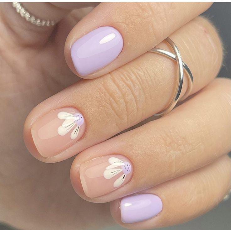 A gentle lavender polish pairs beautifully with nude nails featuring small white daisy flowers. The design is clean, minimal, and gives a soft, elegant April spring vibe.