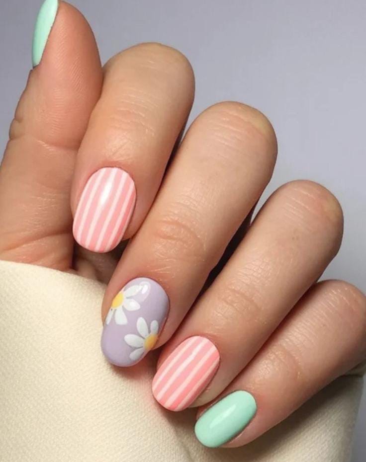 Soft pink stripes and pastel mint tones create a playful spring look with a lavender daisy accent nail. The design feels bright, fresh, simple and perfectly cheerful for April days