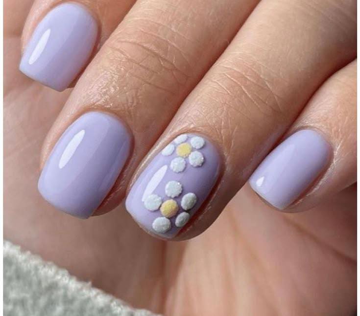 Soft lavender nails create a calm, spring-ready look with one accent nail featuring a simple white daisy design. The combination feels fresh, minimal, and perfect for an easy April manicure.