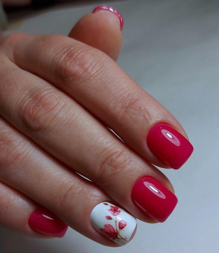 Glossy red nails create a bold, clean look with a soft floral white accent on one nail. The delicate flower design on a white base adds a fresh and feminine April spring vibe.