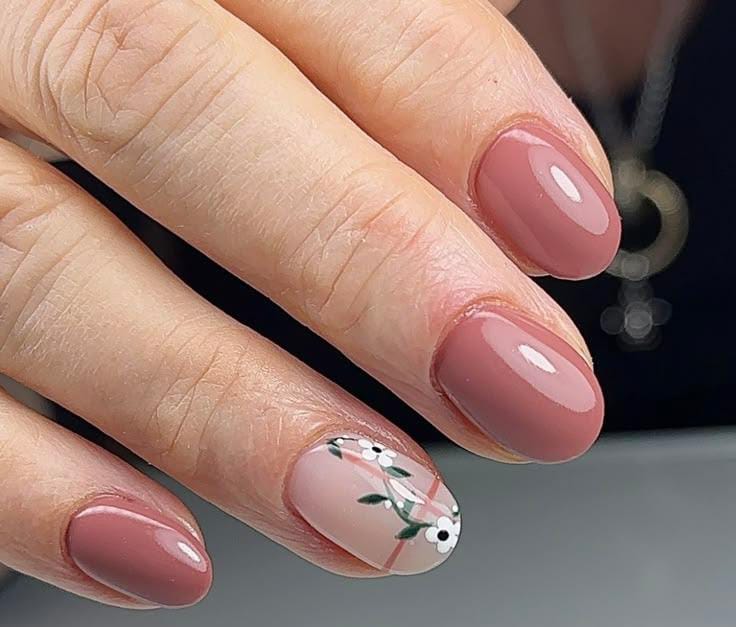 Glossy dusty-rose nails create a soft and elegant base for a minimal floral accent. The delicate white flower on a nude nail adds a subtle and classy April spring touch.