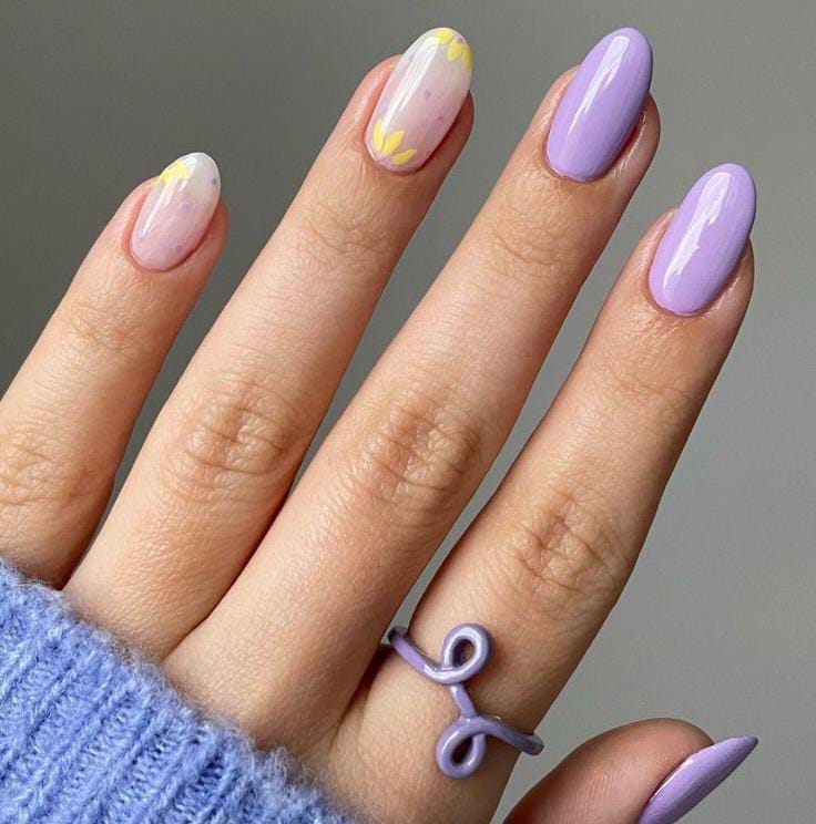 Lavender and soft yellow pastel nails create a bright and cheerful spring palette. A hand-painted floral accent adds a playful garden-inspired touch perfect for April.