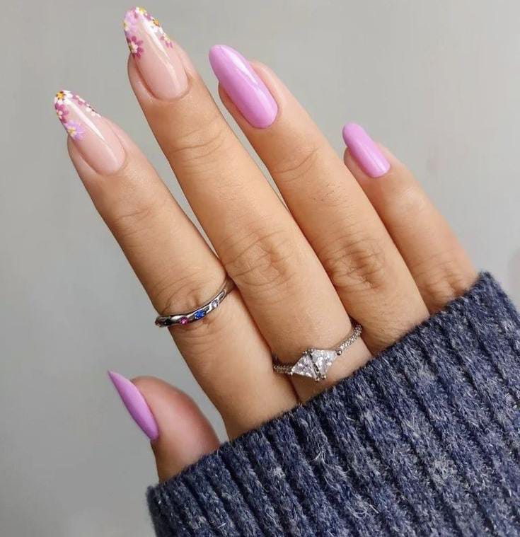 Glossy lilac nails are paired with delicate pastel floral accents for a light and cheerful spring vibe. The soft colors and simple flower details make the design look elegant yet playful April vibe.