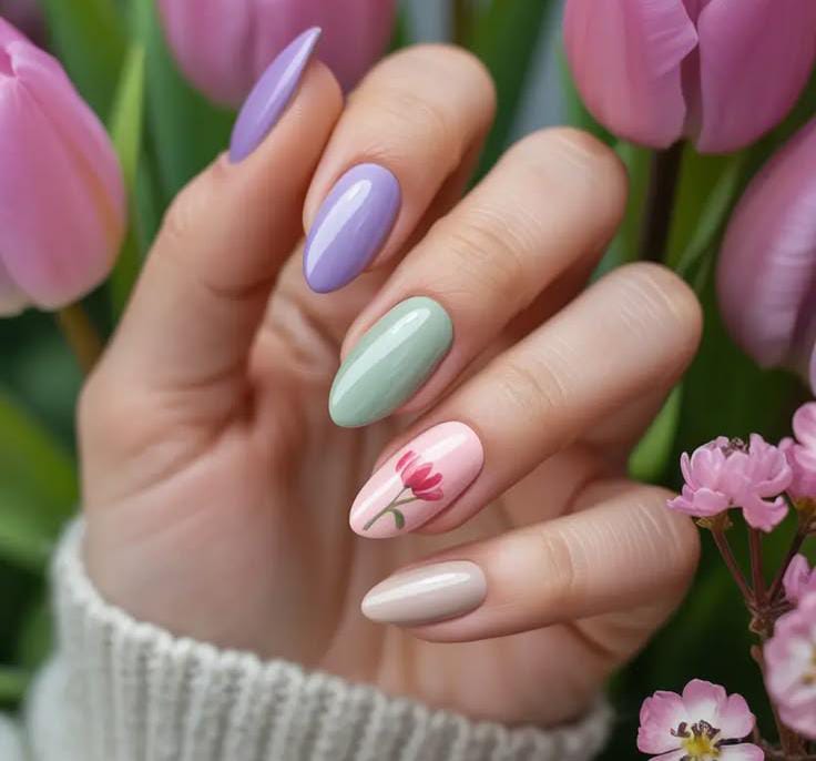 This manicure soft pastel shades like pink, blue, yellow and lavender for a playful spring look. One accent nail shows a cute tulip design that gives the style a fresh April garden-inspired vibe. 🌸