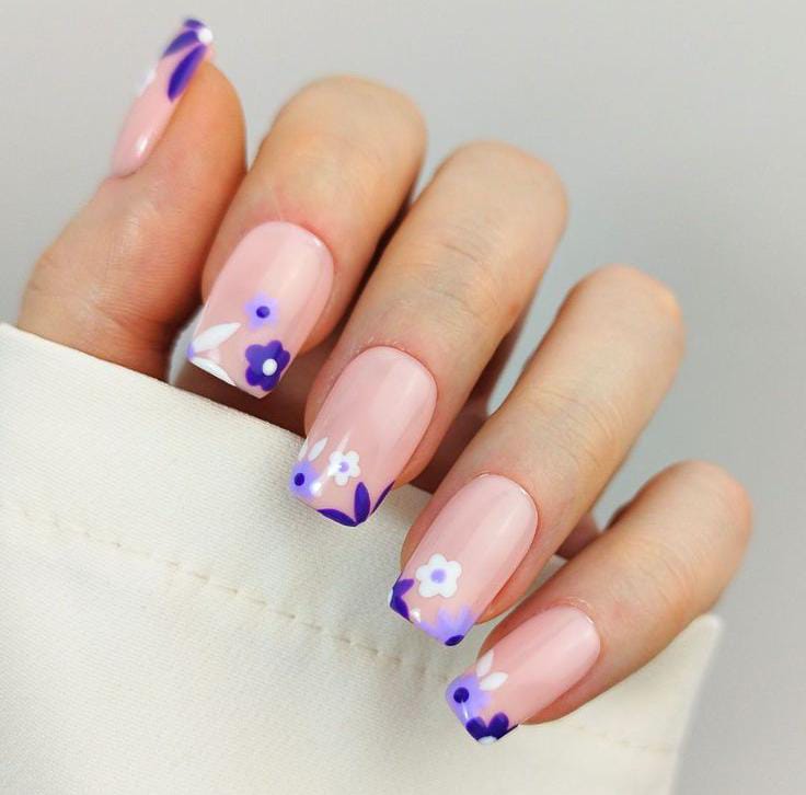 A soft nude base is paired with delicate purple floral accents along the tips, giving the nails a fresh spring look. The design feels light, clean, and perfect for an easy April style.