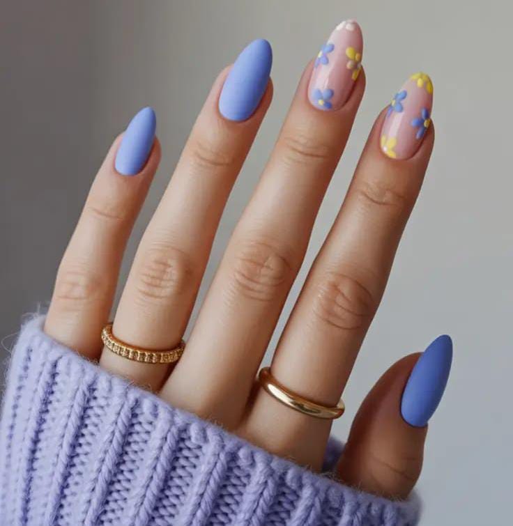 Soft matte pastel blue nails are paired with sheer nude accents decorated with tiny blue and yellow flowers. The delicate floral pattern gives the manicure a light, fresh spring vibe perfect for April.