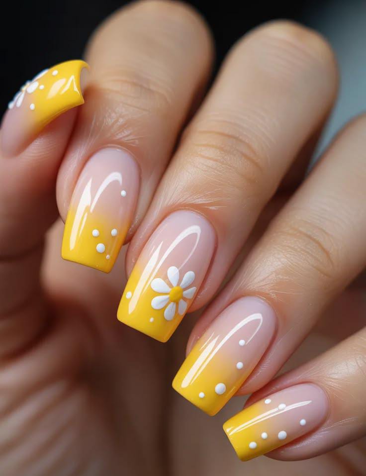 These April nails feature a bright yellow ombre fading into a soft nude base with cute white daisy dotted accents. The cheerful color and simple floral details create a warm, sunny spring look. 🌼