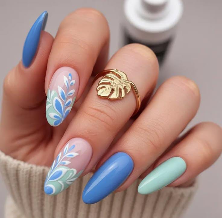These nails combine soft blue and mint shades with delicate white and blue leafy designs on a sheer base. The fresh colors and botanical accents create a calm, nature-inspired spring look and perfect for April .