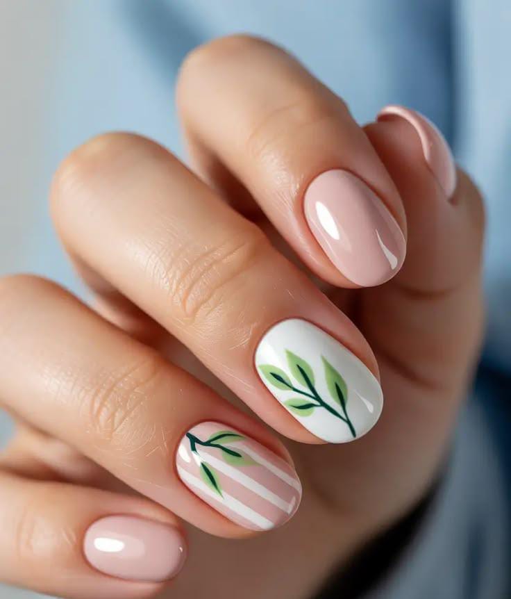 Soft nude and white nails are decorated with simple green leaf details and subtle striped accents. The clean, minimal design gives a fresh and elegant April aesthetic. 🌿