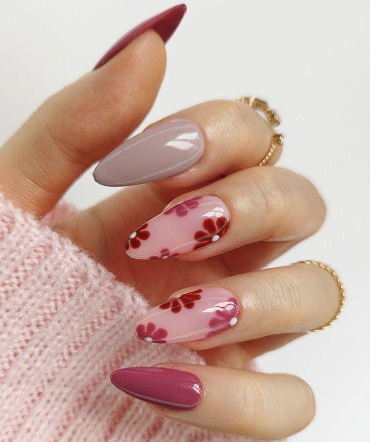 A mix of dusty rose, nude and soft pink nails creates a warm and elegant spring palette. Delicate red floral patterns add a romantic and simple seasonal April vibe.