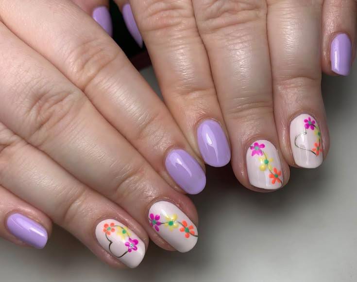 Soft pastel purple nails are paired with creamy accent nails decorated with tiny colorful flowers and delicate line art. The design feels simple, cheerful, and perfect for a fresh April spring look.
