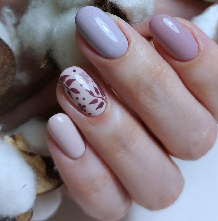 Muted lavender, soft nude and blush shades create a calm, elegant base with a subtle leafy dotted botanical pattern on one accent nail. The design is minimal, classy, and gives a gentle April springtime vibe.