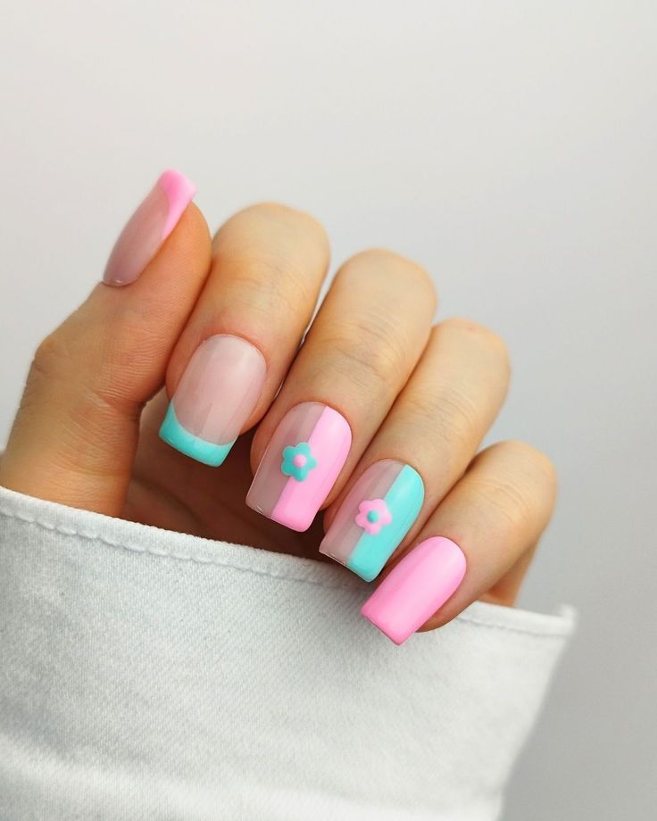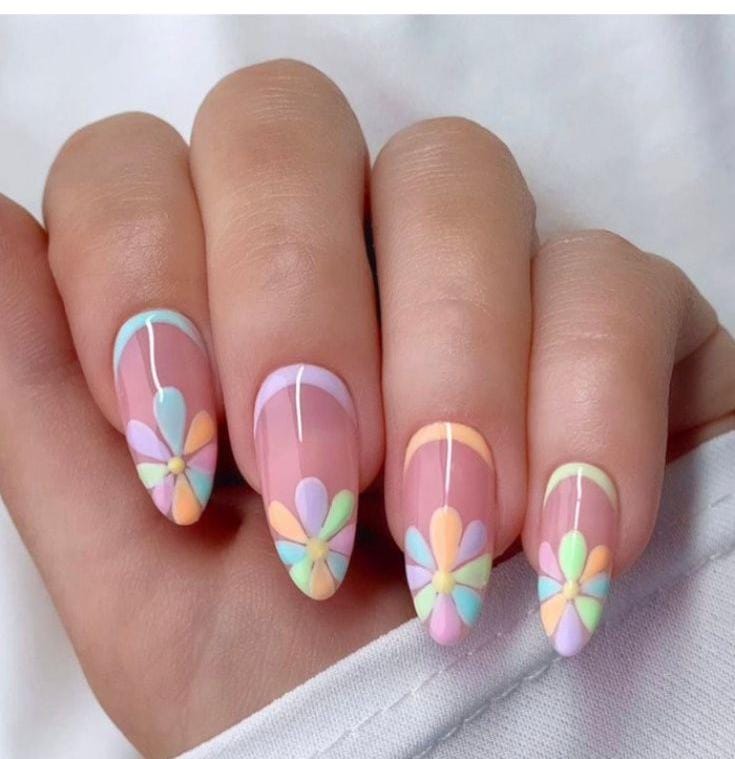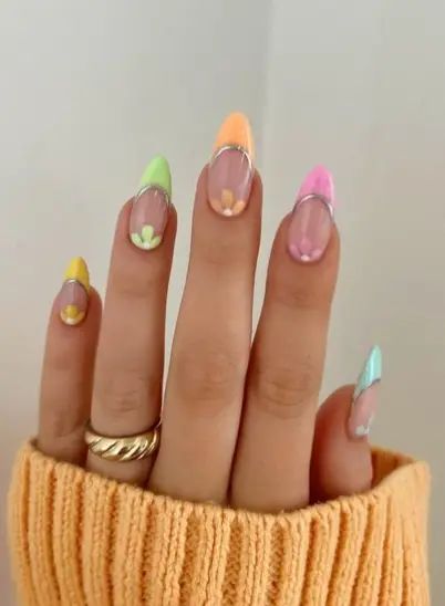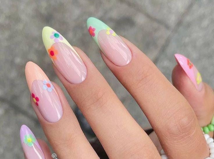 Soft pastel French tips in peach, mint, lilac, and pink blend into a glossy nude base. Tiny colorful flowers add a fresh, delicate touch that feels bright and spring-ready.