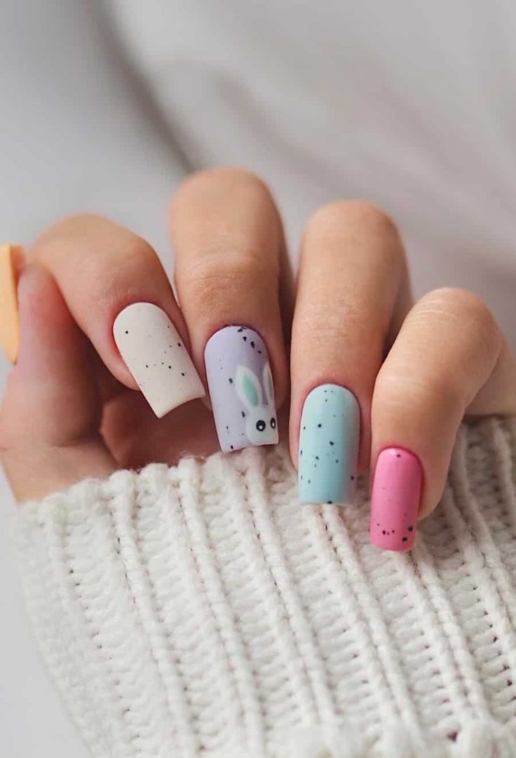 Soft pastel nails in lavender, baby blue, pink, and white are finished with tiny black speckles for a fun speckled-egg effect. A cute bunny accent nail adds a playful Easter touch to the sweet, matte look.