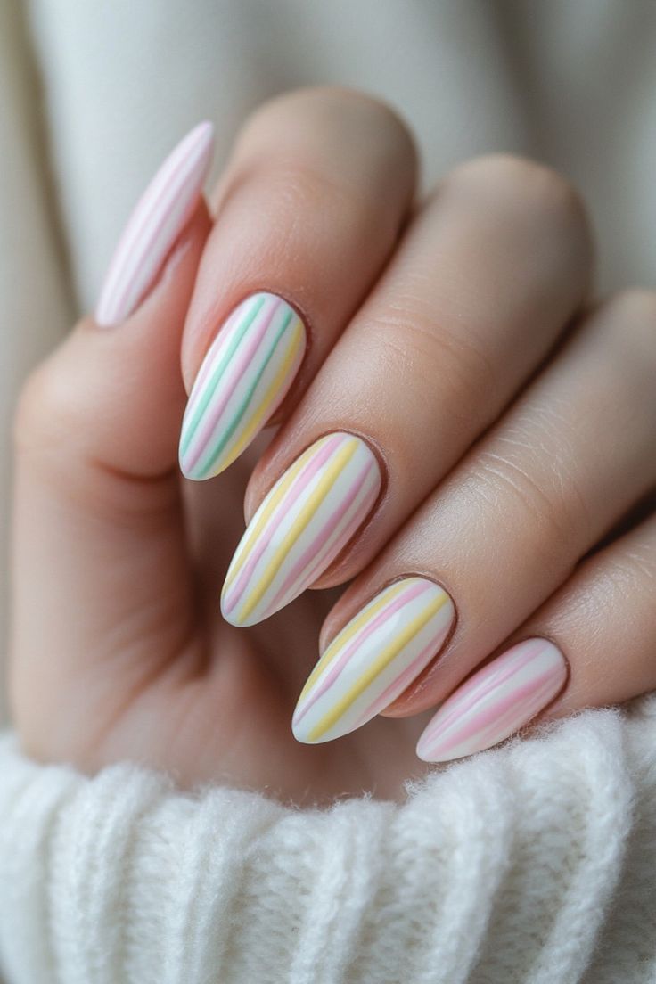 A creamy nude base is topped with thin pastel stripes in pink, yellow, green, and blue for a delicate rainbow effect. The design feels light, clean, and subtly festive for Easter.