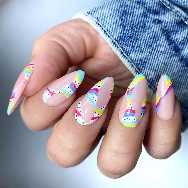 These nude-based nails feature colorful pastel swirls and dotted details inspired by decorated Easter eggs. The mix of pink, yellow, blue, and white gives it a bright and cheerful spring vibe.