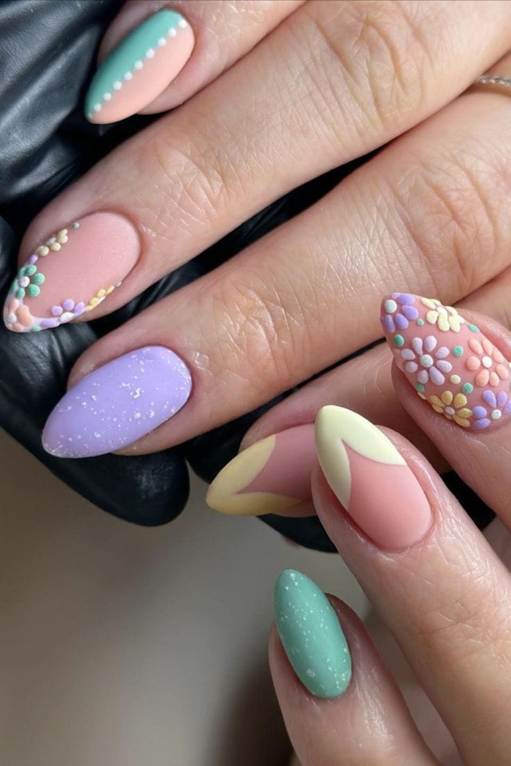 A mix of pastel shades, floral accents, and speckled polish gives these nails a soft springtime feel. The design feels fresh and whimsical, like a blooming Easter garden.