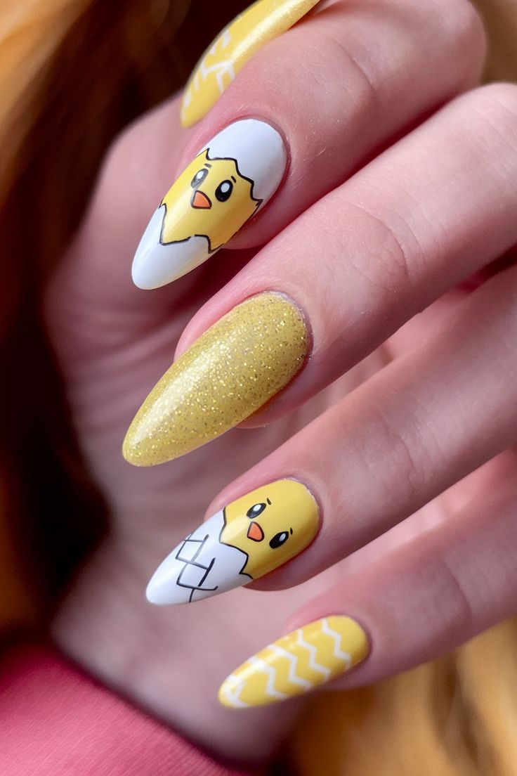 Bright yellow glitter nails mix with adorable baby chick art for a fun Easter statement. The glossy white accents and cartoon details make the design feel cheerful and festive.