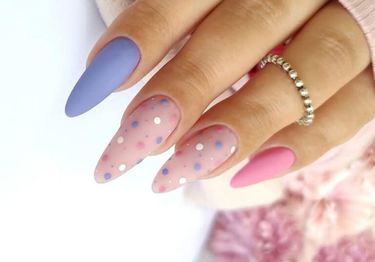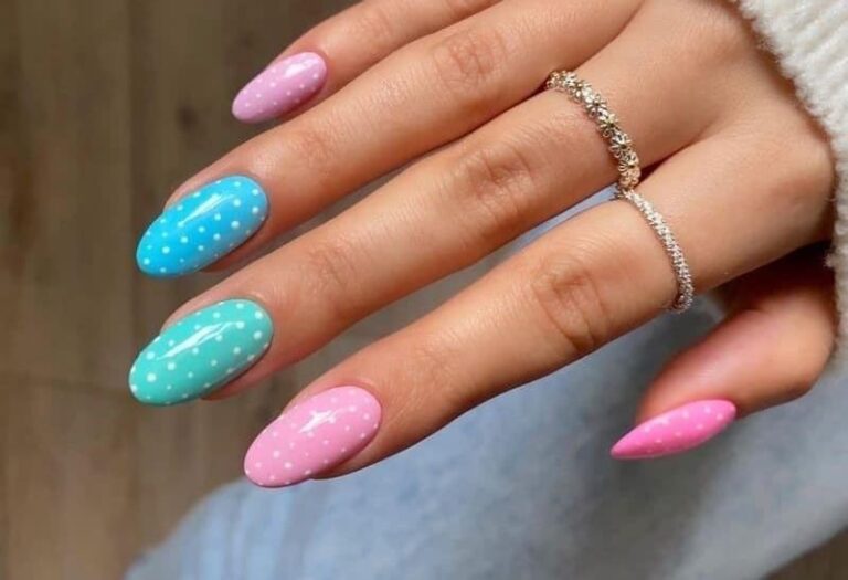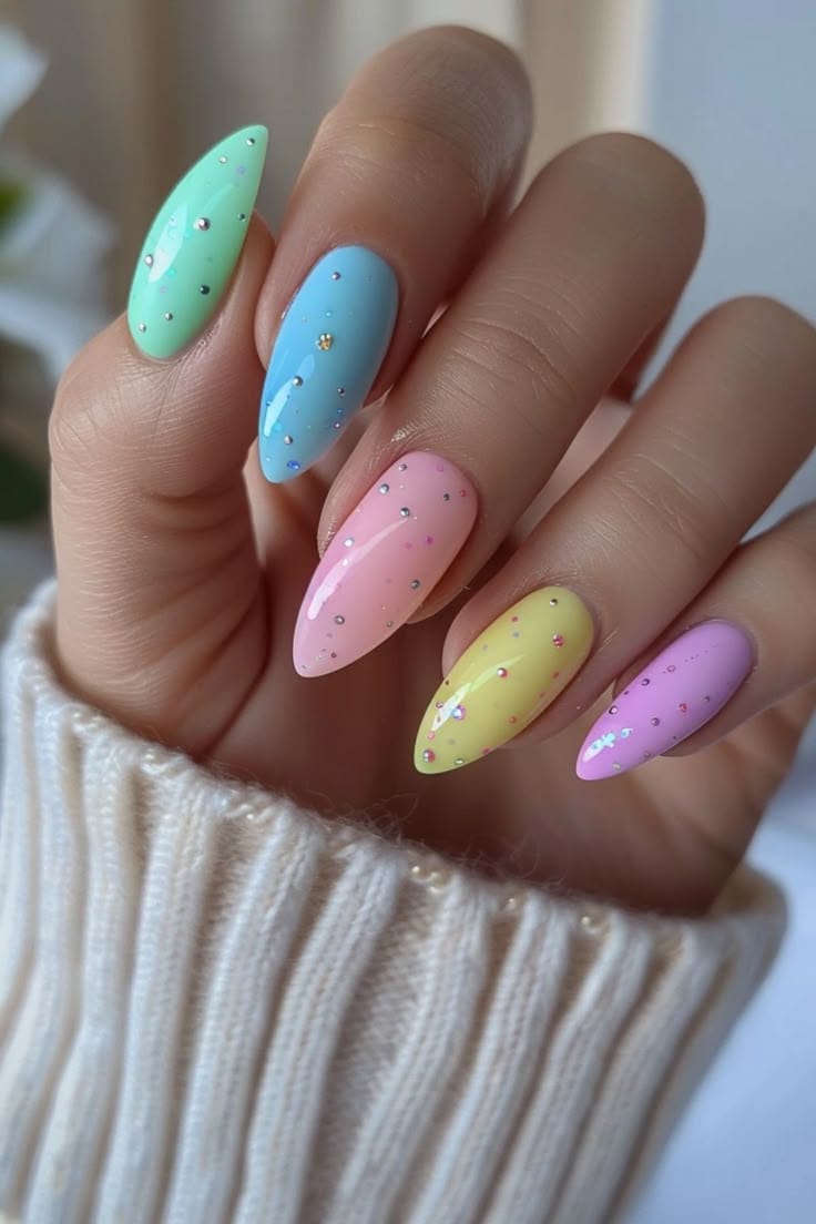 Glossy almond-shaped nails in blue, pink, and mint are finished with tiny white polka dots. The design feels soft, cute, and perfectly suited for Easter celebrations.