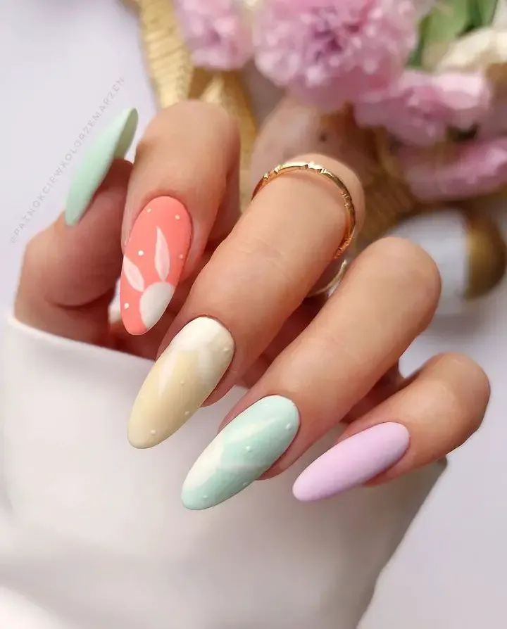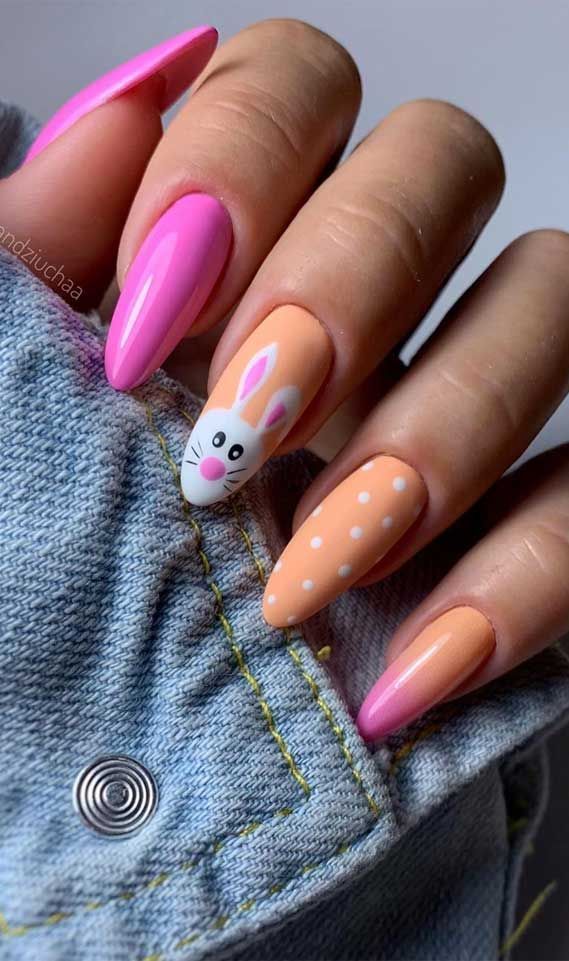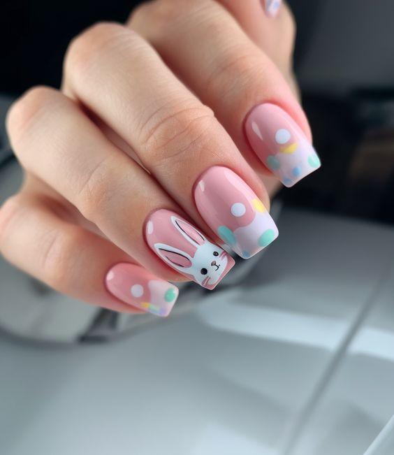 This design pairs blush pink nails and polka dots with a feature bunny accent nail for a fun Easter touch. The mix of soft colors and patterns feels light, festive, and easy to wear.