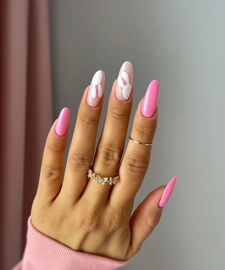 Glossy bubblegum pink nails are paired with delicate white floral accents for a fresh spring look. The design feels clean, feminine, and perfect for a subtle Easter touch.