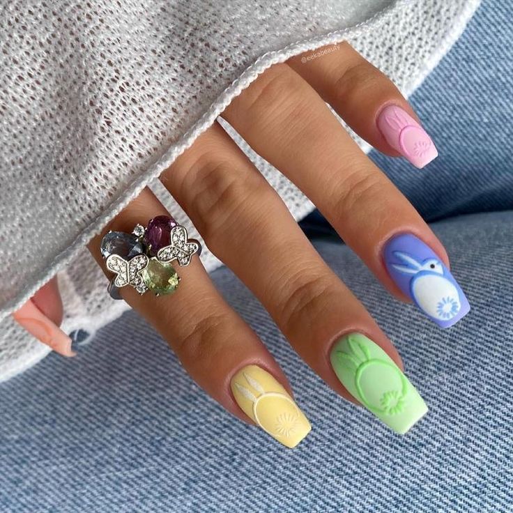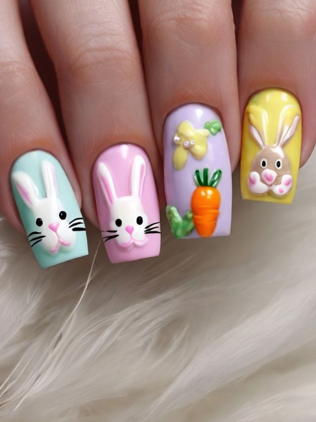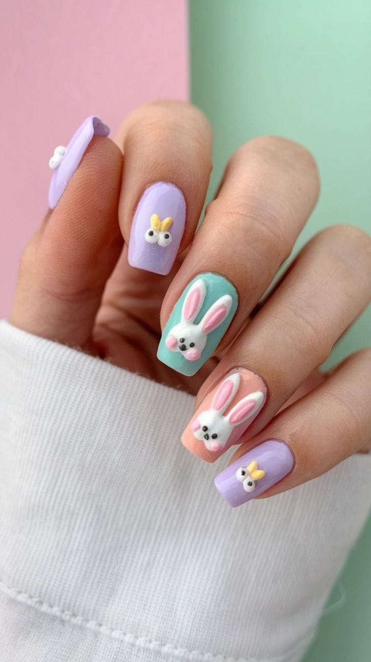 Bright pastel nails in purple, mint, and peach are paired with adorable raised bunny details. The playful 3D accents give the manicure a fun and festive Easter feel.