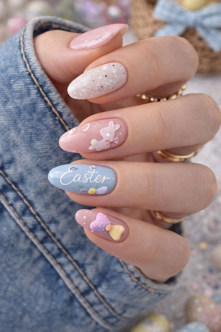 Soft pastel pinks, blues, and creamy whites create a sweet Easter look with glitter accents and cute bunny art. The overall vibe is playful, glossy, and delicately festive.
