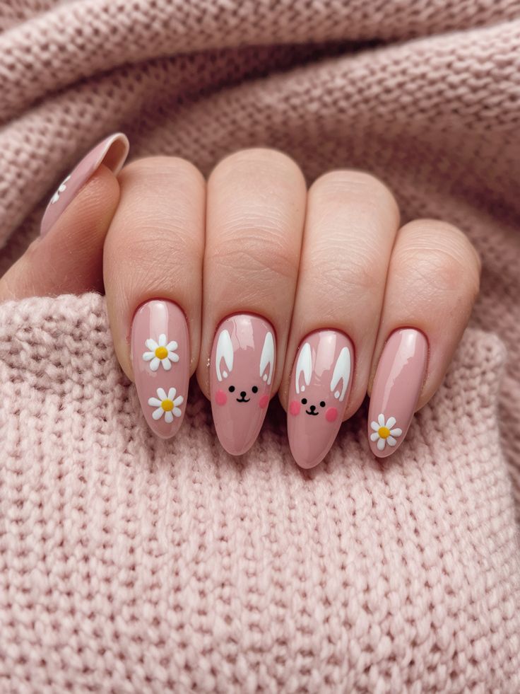 Warm blush pink nails feature adorable bunny faces and small daisy details. The design feels cozy, cute, and effortlessly charming.
