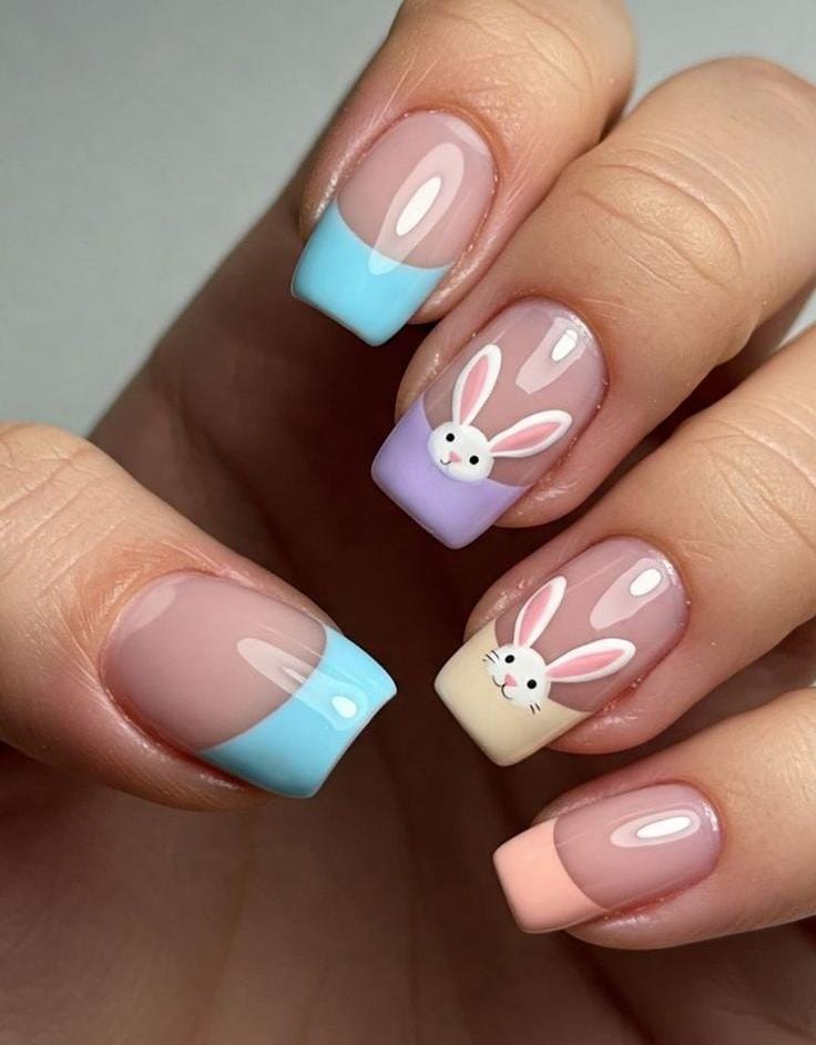 Soft pastel French tips in blue, lilac, peach, and cream create a fresh spring look. Cute little bunny accents add a sweet and playful Easter vibe.