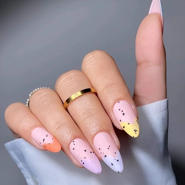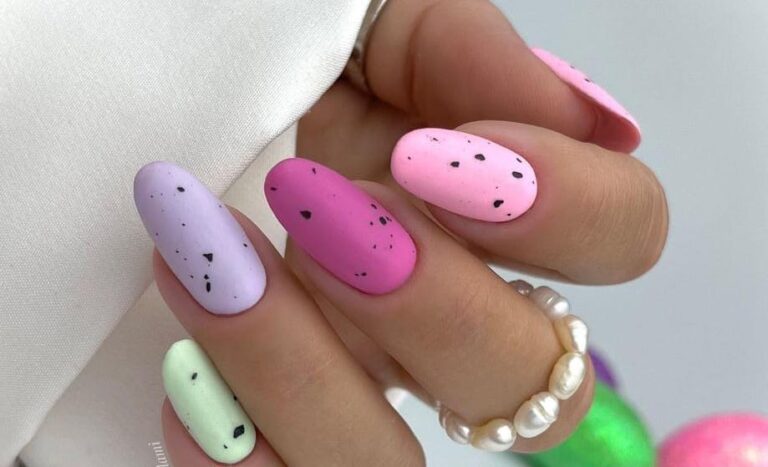 Matte pastel shades like lavender, pink, and mint are topped with black speckles for an egg-inspired effect. The look is simple, trendy, and effortlessly seasonal.
