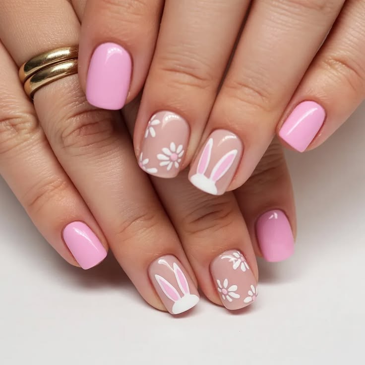 Soft pink nails are paired with nude accent nails featuring delicate white flowers and simple bunny ear art. The look is sweet, minimal, and perfect for a cute Easter vibe.