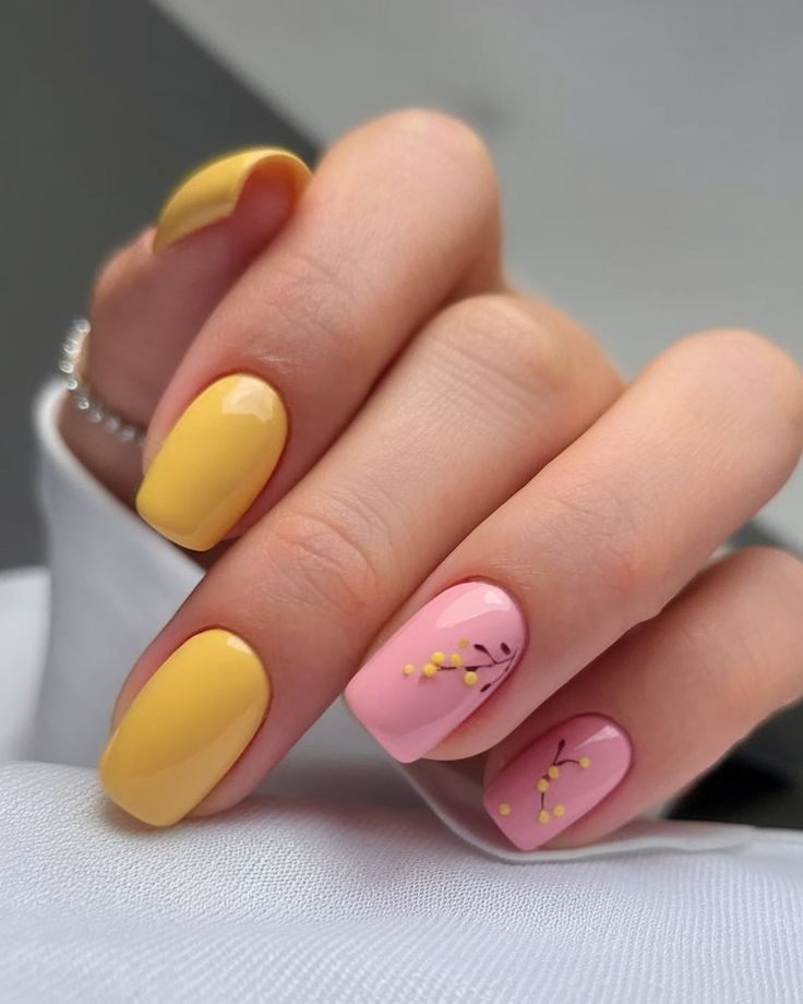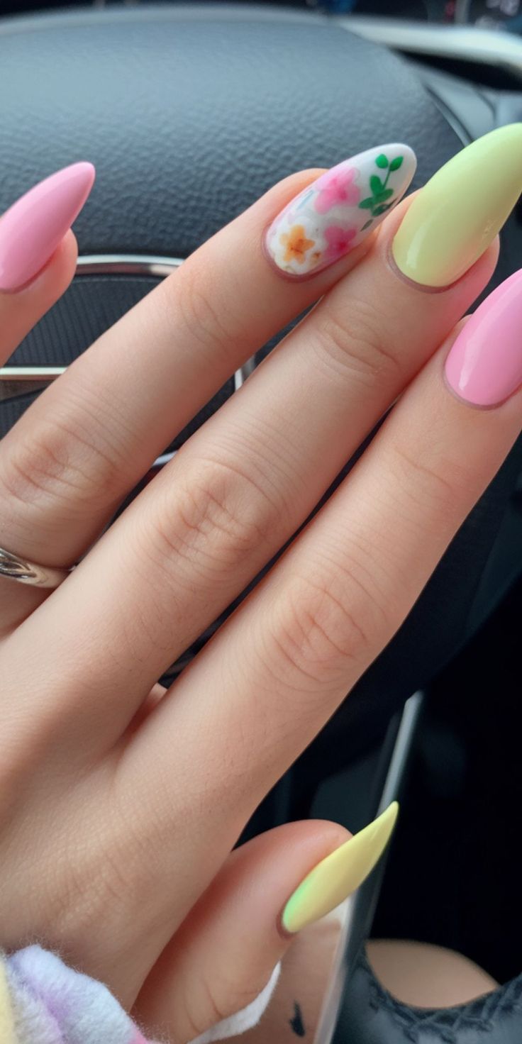 A cheerful mix of glossy yellow and soft pink nails creates a bright, spring-ready look. The delicate floral accents add a light, fresh Easter vibe without feeling overdone.