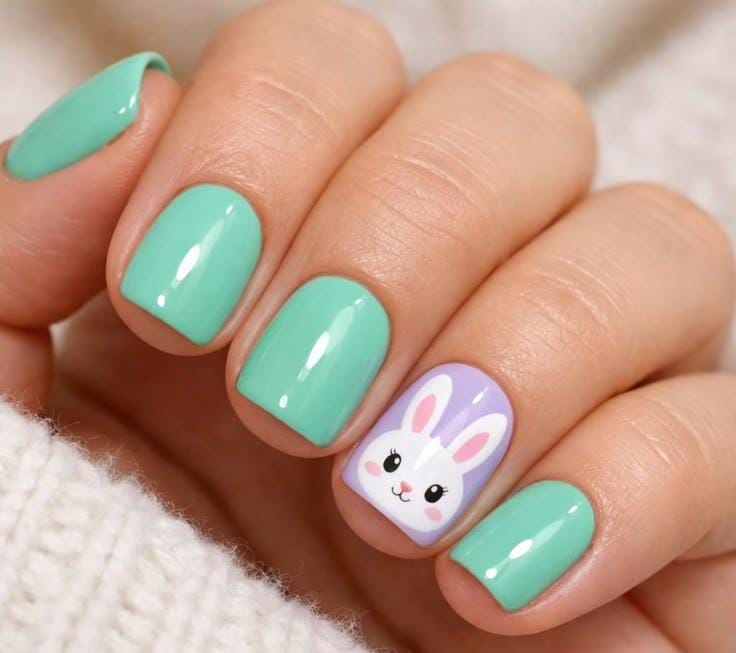 Glossy mint green nails are complemented by a lavender accent nail with an adorable bunny face. It’s simple, cute, and full of cheerful Easter charm.