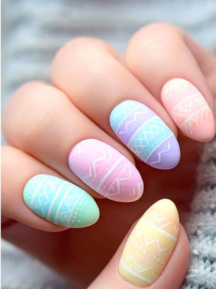 Muted pastel shades in pink, purple, and blue create a soft matte finish with delicate speckled dots. The almond shape and subtle pattern give it a sweet, modern Easter touch.