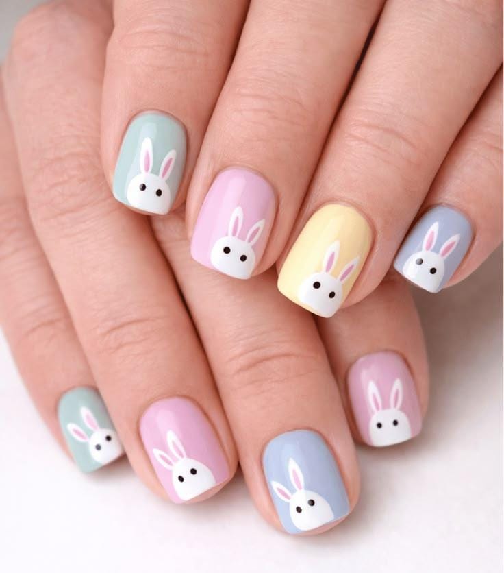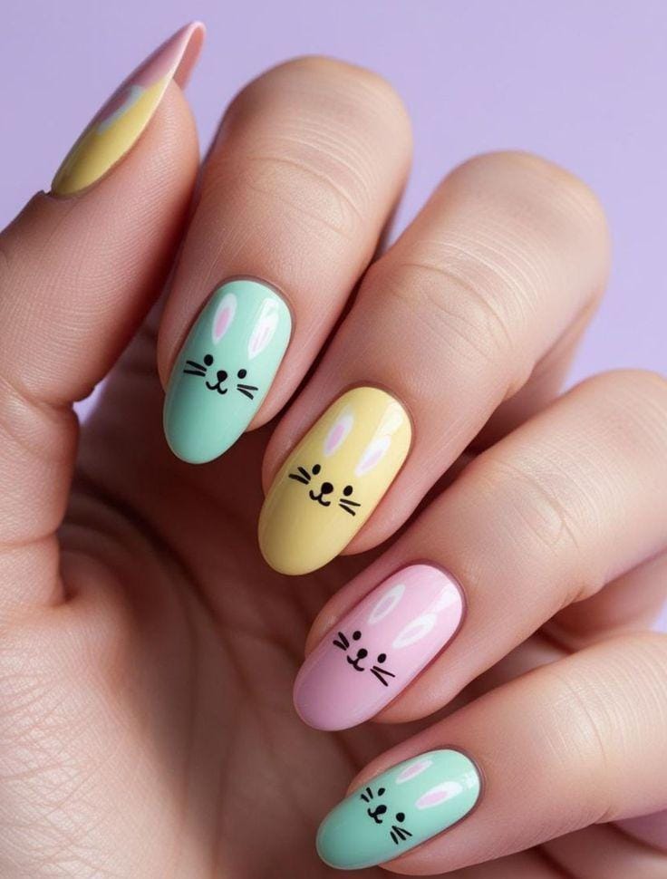 Soft pastel shades like mint, yellow, and pink create a playful Easter look with tiny bunny faces on each nail. The glossy finish and simple art give it a cute, cheerful spring vibe.