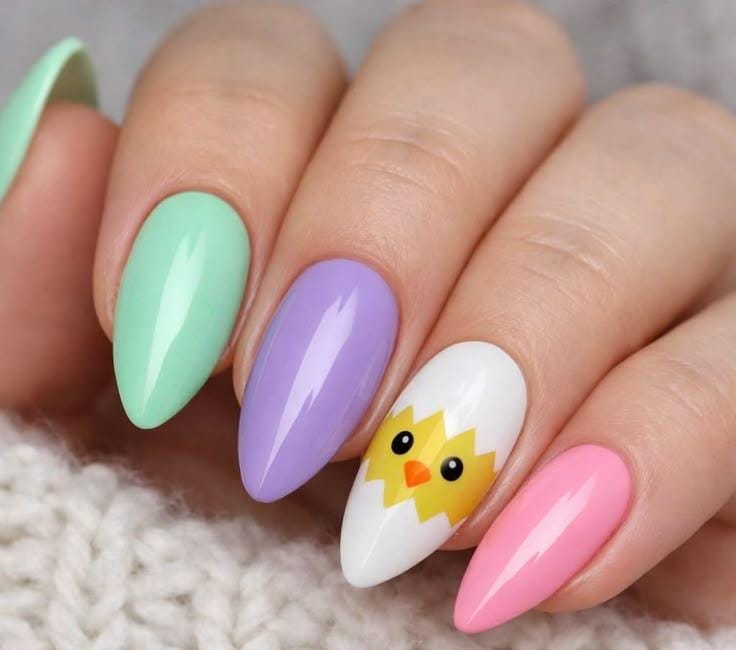 A mix of pastel green, purple, pink, and white creates a fun spring palette. The adorable chick accent nail adds a bright, playful Easter focal point.