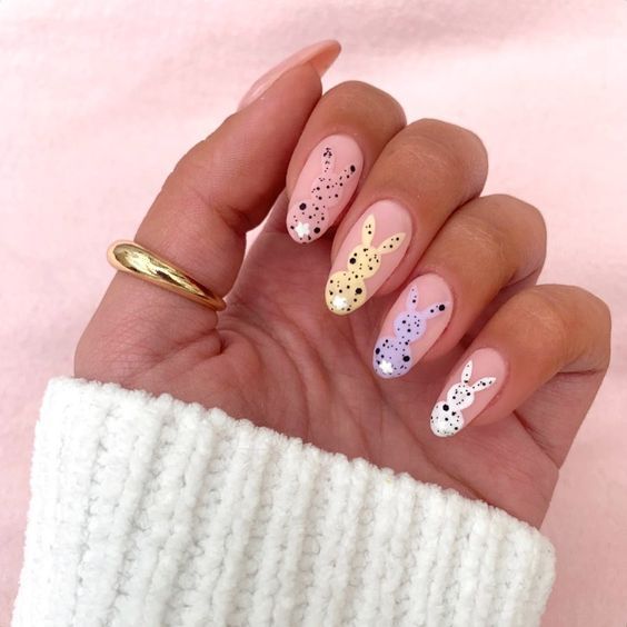 These soft nude-pink nails are decorated with simple pastel bunny silhouettes and tiny speckles. The look is subtle, sweet, and perfect for an easy yet festive Easter manicure.