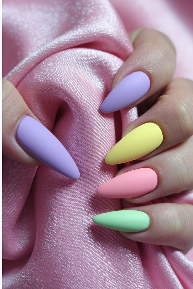 Matte almond-shaped nails in lavender, yellow, pink, and mint create a soft rainbow effect. The smooth pastel palette gives it a clean, modern springtime feel.
