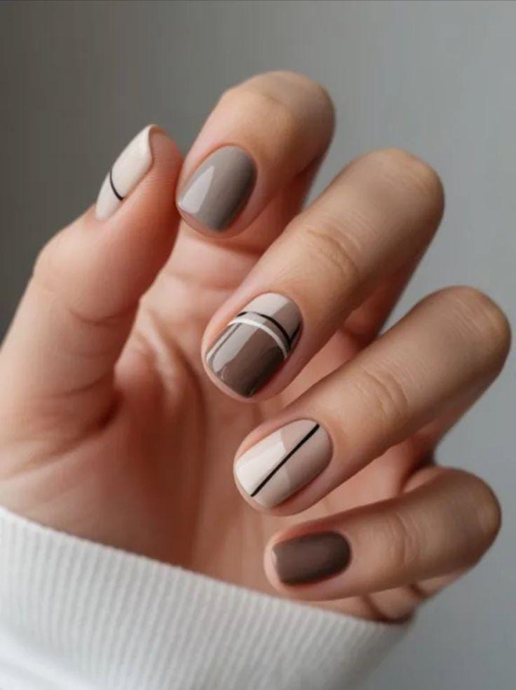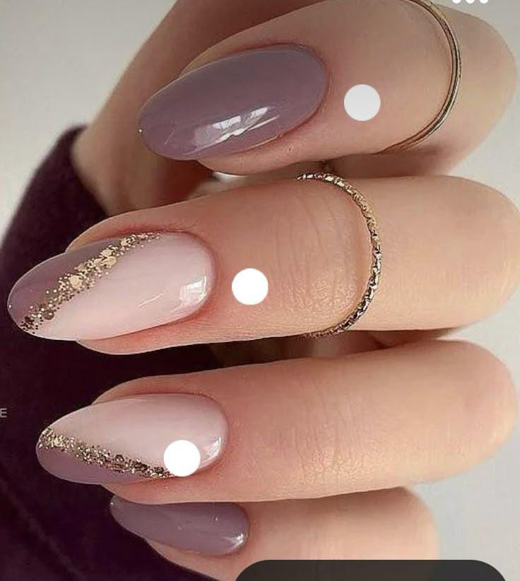A refined mix of muted mauve and nude nails, elevated with delicate diagonal strokes of gold glitter. The look balances simplicity with sparkle, making it both subtle and luxurious.