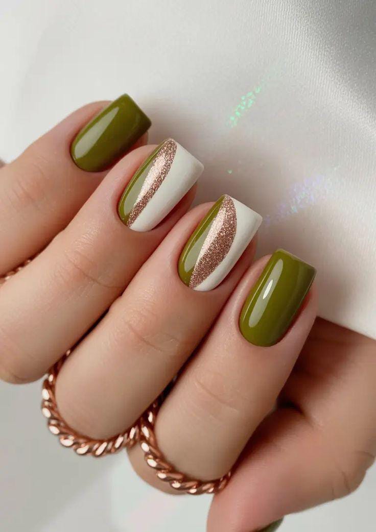 A chic mix of deep olive green, soft white, and a touch of rose-gold glitter, creating a sophisticated yet modern vibe with bold color-blocking.