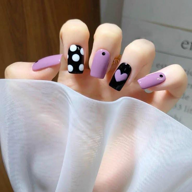 A fun blend of lilac and black with polka dots, heart motifs, and minimal dot accents, combining elegance with a youthful, playful energy.