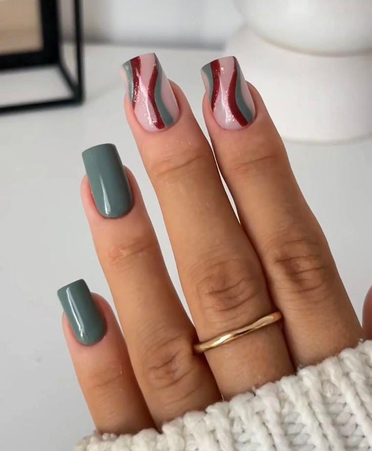 Cool grey paired with nude tones and soft wavy lines in muted red and shimmer, giving a calm, refined look. It’s stylish, perfect for a classy everyday statement.