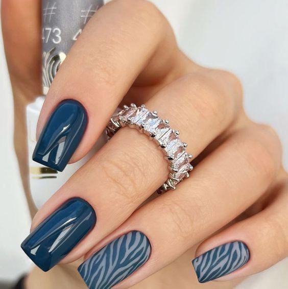 Deep navy nails accented with zebra-inspired patterns in matching tones, striking the perfect balance between wild and elegant.