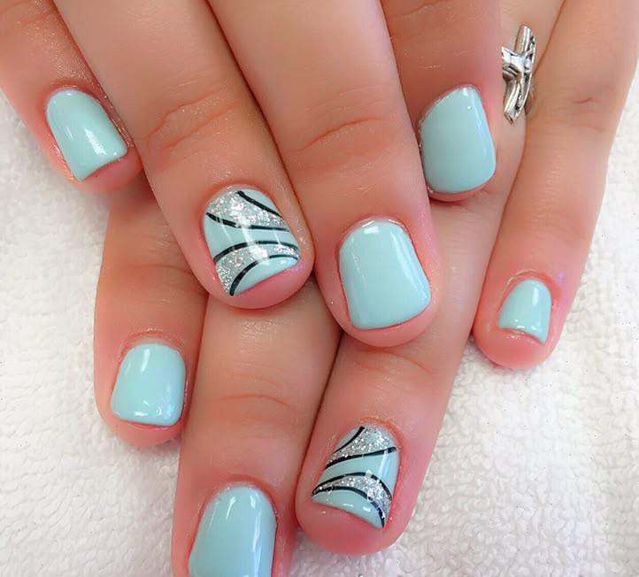 Fresh aqua blue nails with silver glitter and black swirl accents, offering a light, airy elegance. It’s classy with a hint of sparkle, ideal for a polished yet refreshing style.