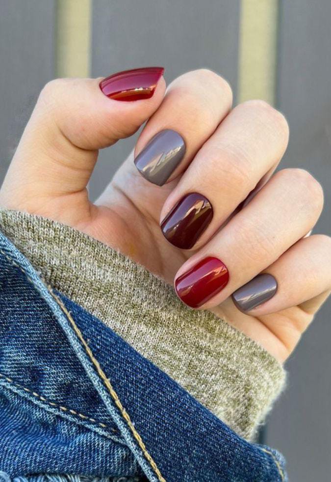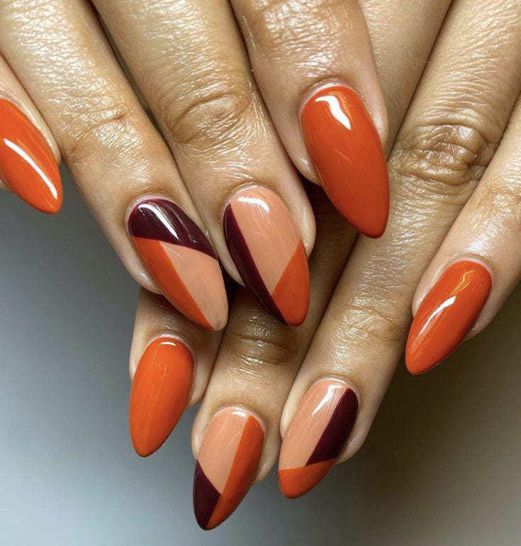 With deep orange, nude, and burgundy arranged in sharp angular patterns, these nails give off a stylish seasonal vibe while maintaining a high-fashion edge.