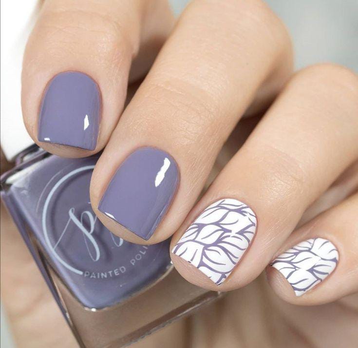 Pastel lavender nails paired with accent nails in nude, featuring bold black leafy patterns. The design feels fresh, stylish, and sophisticated.
