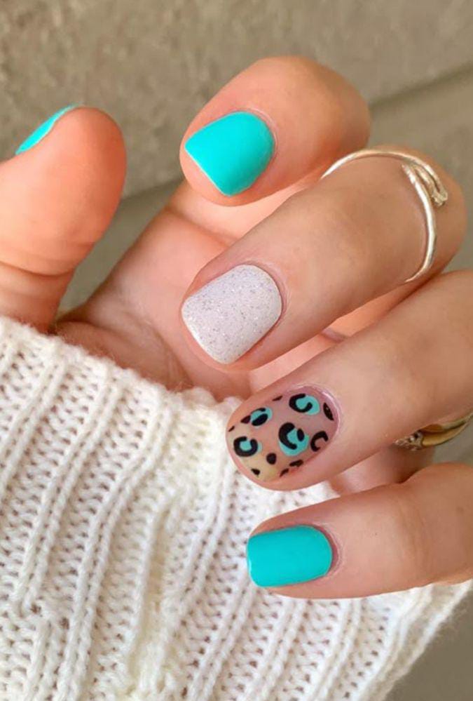 Bright turquoise, sandy nude, and leopard print combine into a bold yet classy look, striking the perfect balance between fun and fashionable flair.