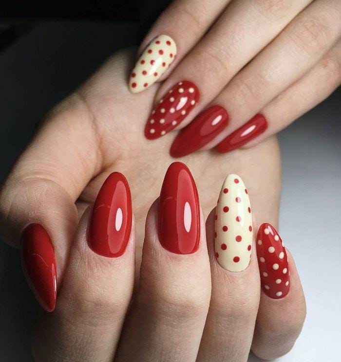 A glamorous red paired with cream nails dotted in matching scarlet offers a vintage-inspired yet modernly elegant style that feels both playful and classy.